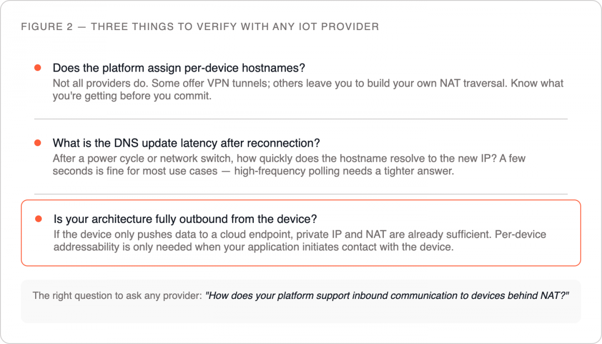 Ask whether the platform assigns per-device hostnames. Not all providers do. Some offer VPN tunnels as an alternative; others offer nothing and leave engineers to build their own NAT traversal. Know what you’re getting before you commit.