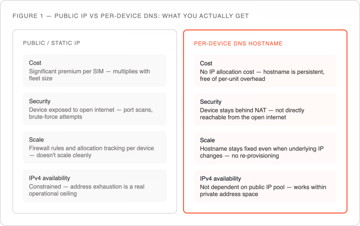 Beyond cost and security, there’s a practical ceiling: if you’re managing hundreds or thousands of devices across multiple countries, static IP management becomes its own infrastructure problem. Tracking allocations, managing firewall rules per IP, handling re-provisioning when a device is replaced — none of this scales cleanly.
